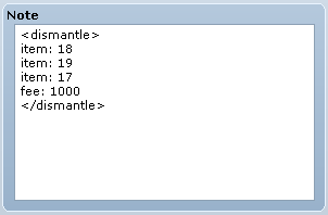 This tag allows you define custom dismantle settings. You can add as many settings between the <dismantle> tags as you like. Only items with this tag will appear in the Dismantle Shop. Any settings you do not include will use the default values defined in the customization module if there are any. The following settings are available: